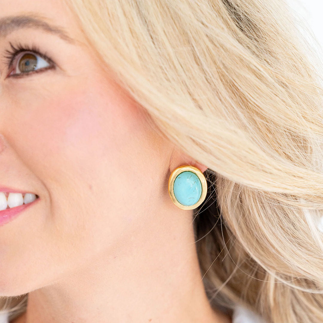 The Caroline Stud earrings showcase a richly-colored genuine turquoise cabochon stone, set in a signature 24K triple-plated gold setting. This pairing of natural stone and gold creates a sophisticated earring that offers both visual impact and classic appeal.