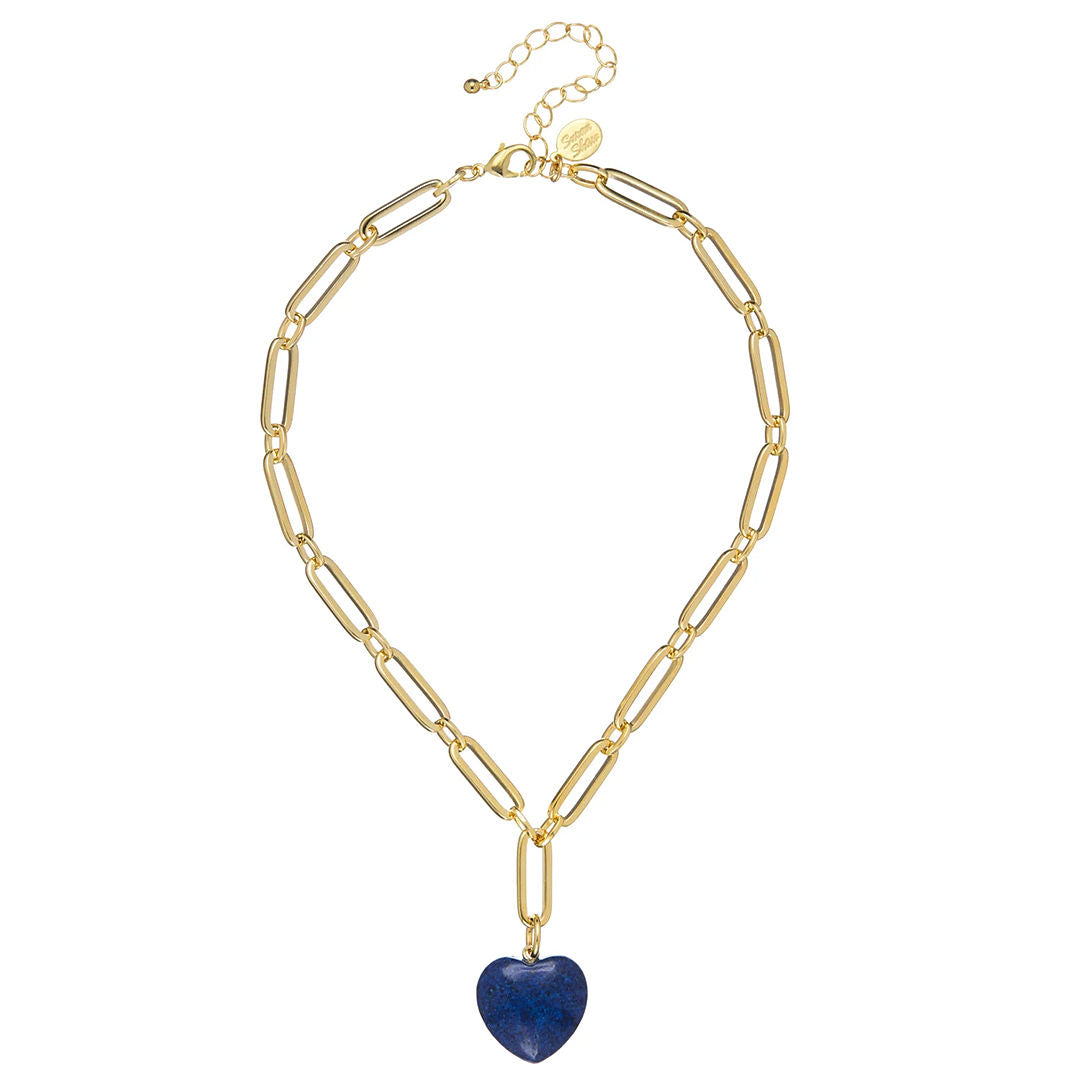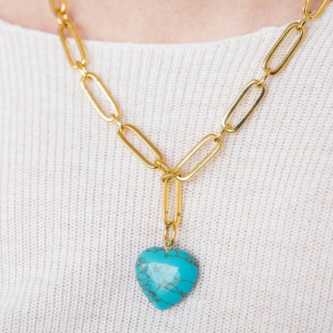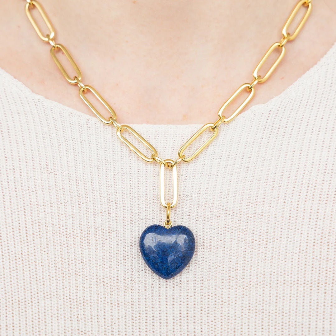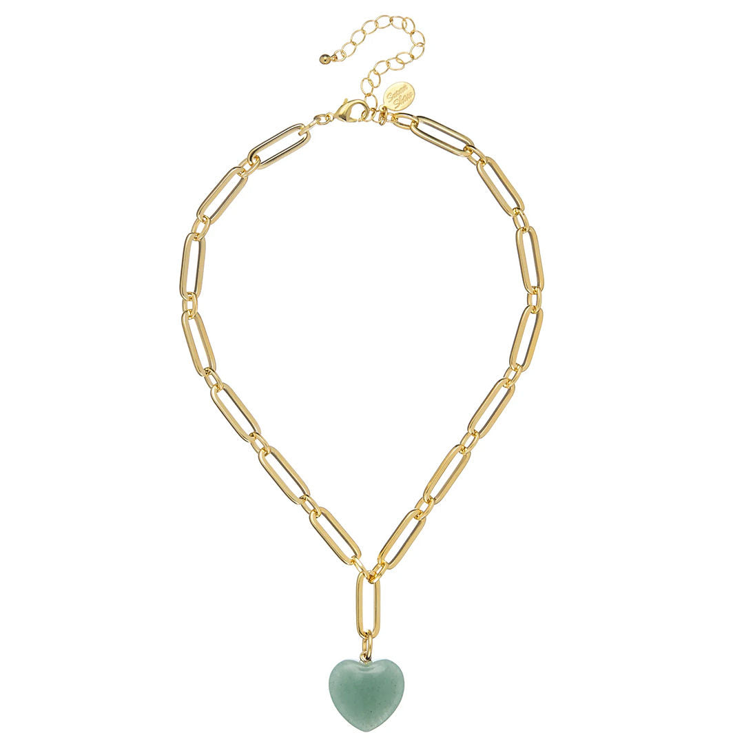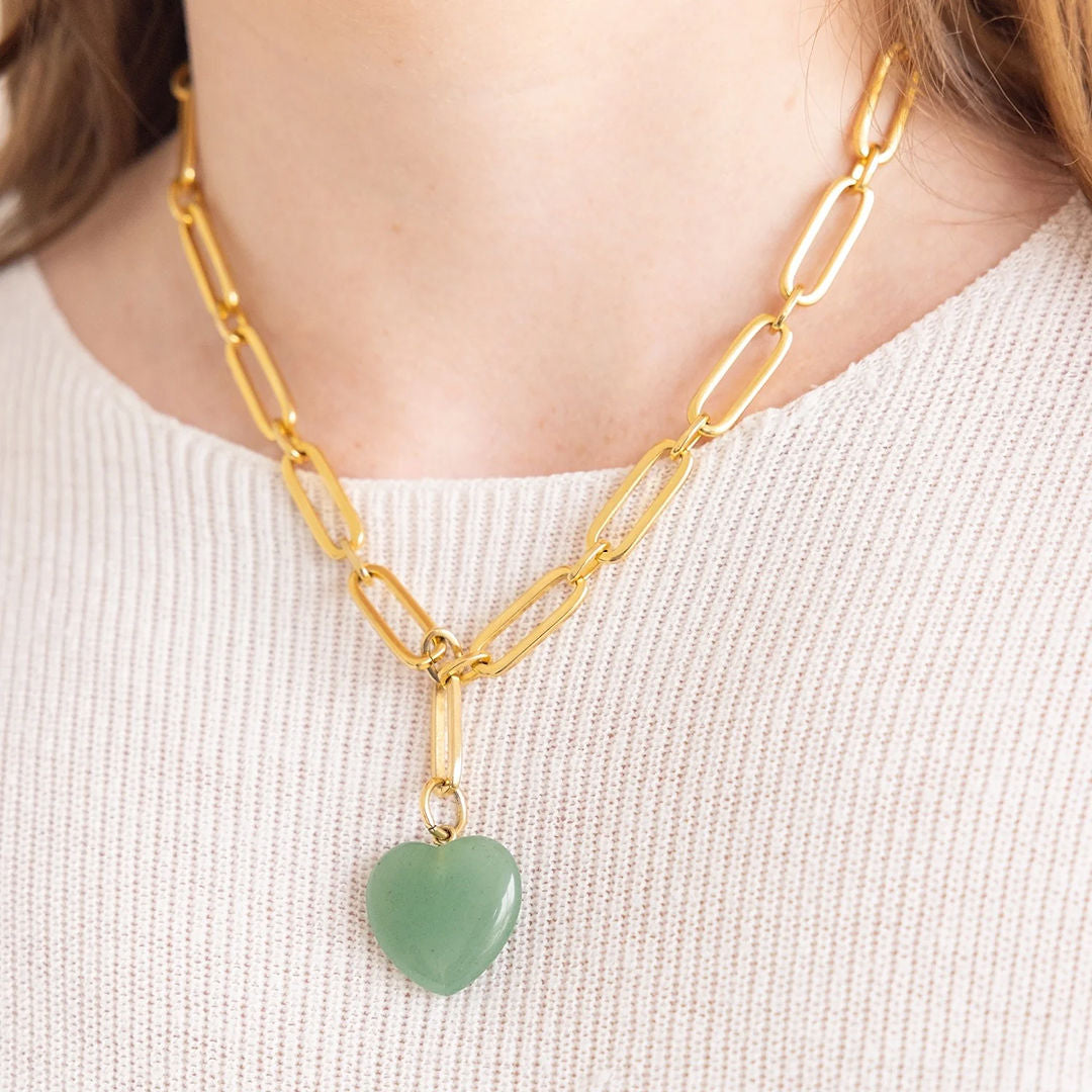 A natural stone heart on a substantial gold paperclip chain — the Monroe is the piece that goes with everything and works every time. The pendant is dimensional and smooth, carved from real stone, and sits at just the right drop to be seen without being overdone.